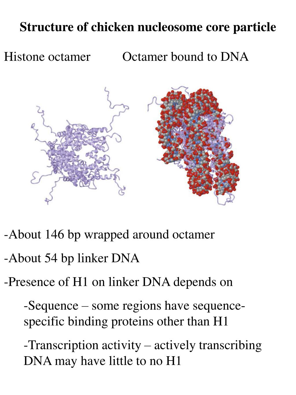 Structure of chicken nucleosome core particle Histone octamer Octamer bound to DNA • About 146 bp wrapped around octamer • About 54 bp linker DNA • Presence of H1 on linker DNA depends on • Sequence – some regions have sequence-specific binding proteins other than H1 • Transcription activity – actively transcribing DNA may have little to no H1