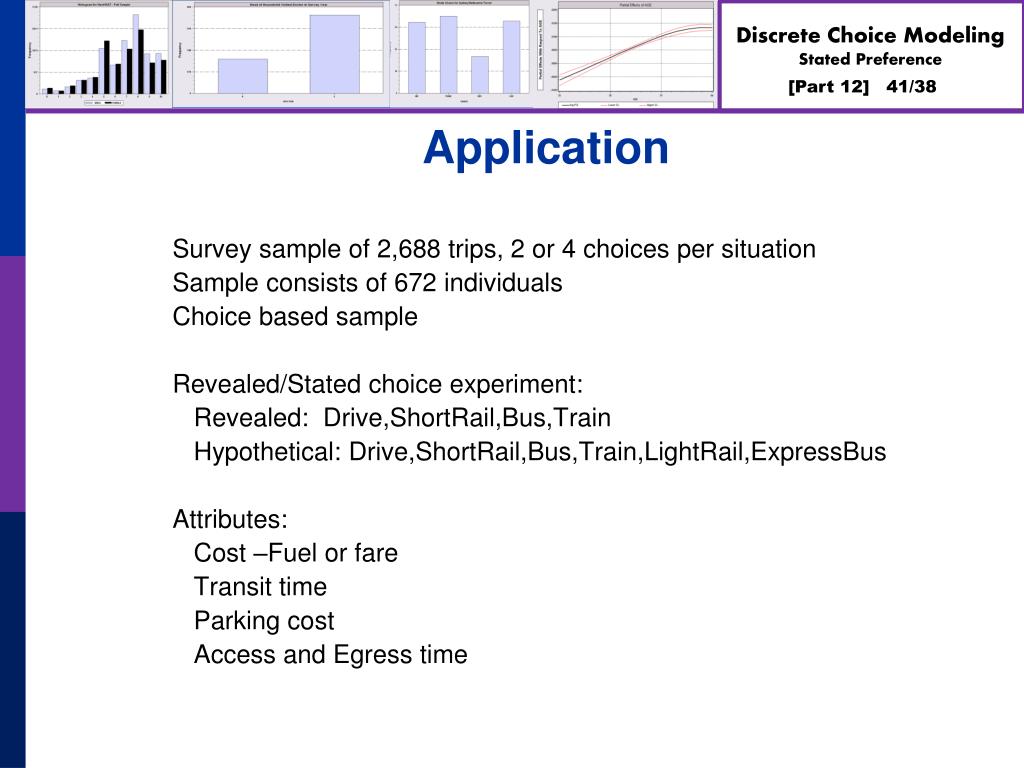 Application Survey sample of 2,688 trips, 2 or 4 choices per situation Sample consists of 672 individuals Choice based sample Revealed/Stated choice experiment: Revealed: Drive,ShortRail,Bus,Train Hypothetical: Drive,ShortRail,Bus,Train,LightRail,ExpressBus Attributes: Cost –Fuel or fare Transit time Parking cost Access and Egress time