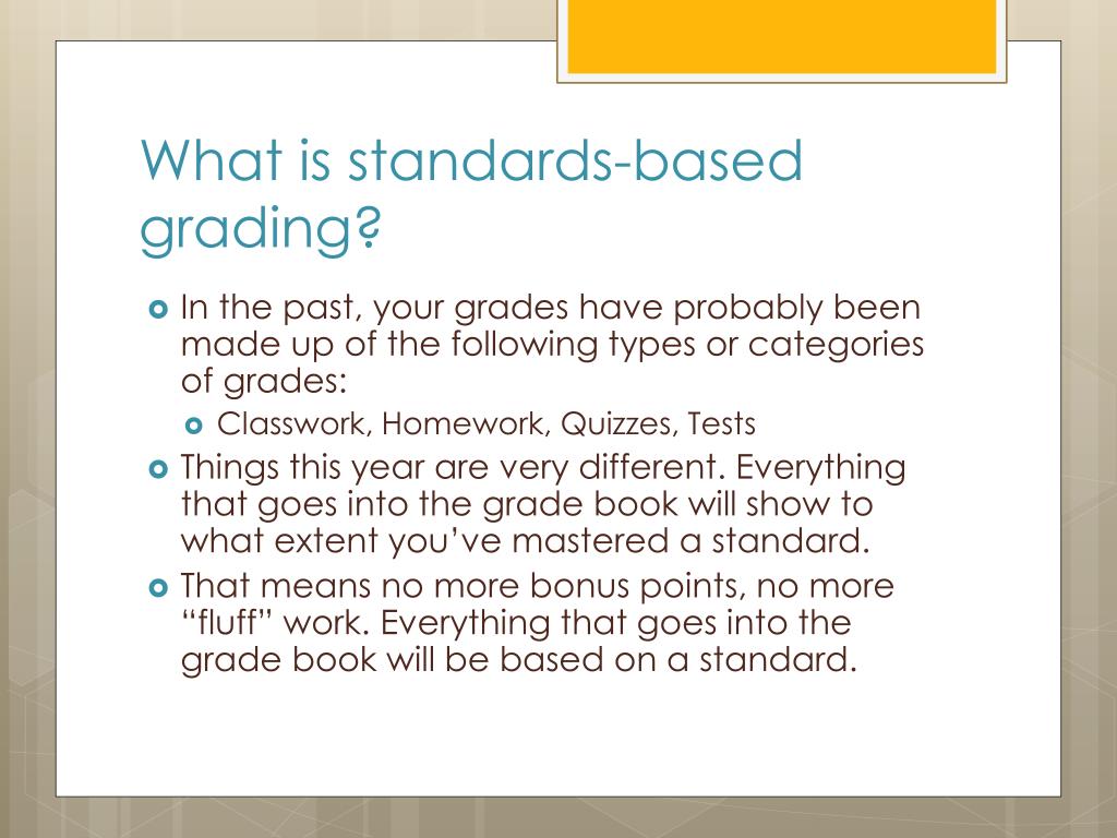 What is standards-based grading? • In the past, your grades have probably been made up of the following types or categories of grades: • Classwork, Homework, Quizzes, Tests • Things this year are very different. Everything that goes into the grade book will show to what extent you’ve mastered a standard. • That means no more bonus points, no more “fluff” work. Everything that goes into the grade book will be based on a standard.