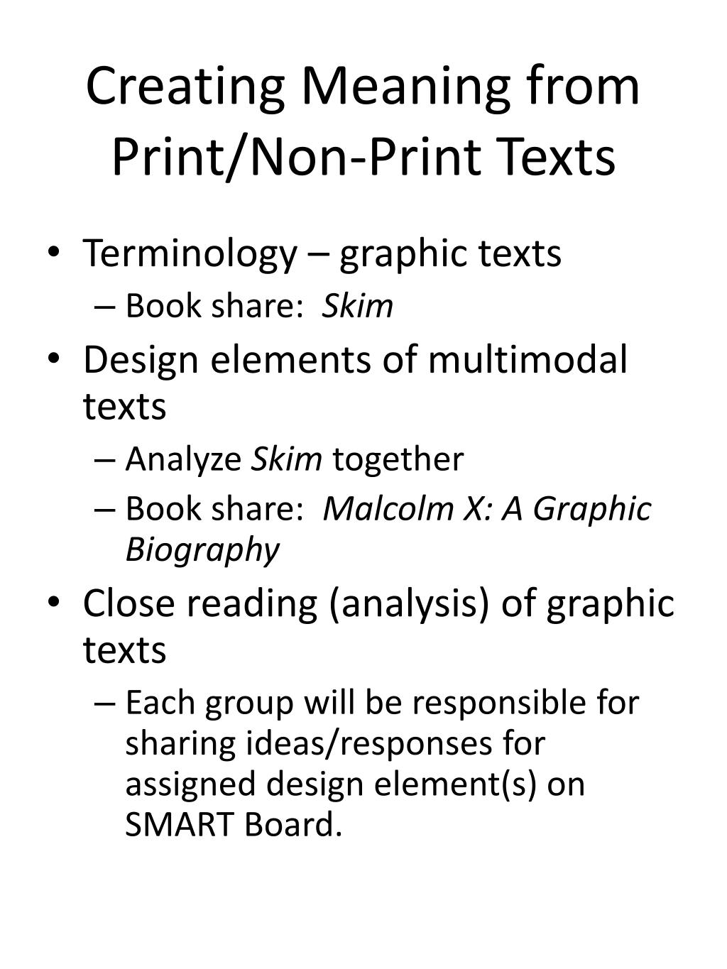 Creating Meaning from Print/Non-Print Texts • Terminology – graphic texts • Book share: Skim • Design elements of multimodal texts • Analyze Skim together • Book share: Malcolm X: A Graphic Biography • Close reading (analysis) of graphic texts • Each group will be responsible for sharing ideas/responses for assigned design element(s) on SMART Board.