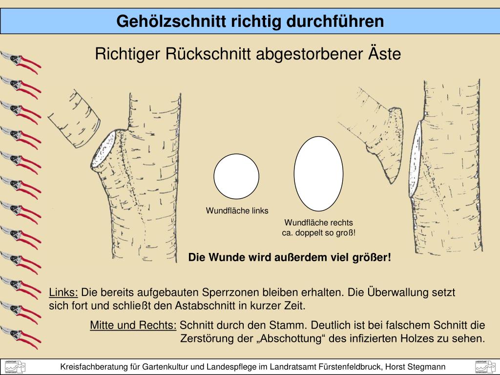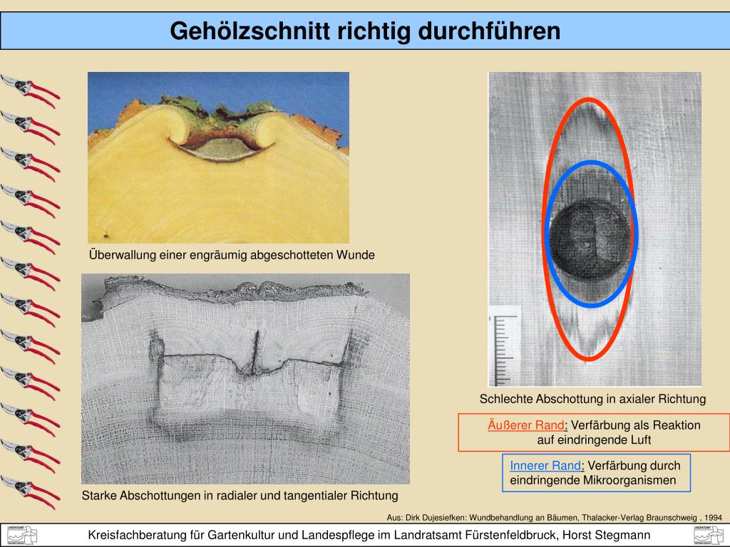 Collar (Kragen) richtiger Schnitt Wundfläche links falscher Schnitt Wundfläche rechts ca. doppelt so groß! Richtiger Rückschnitt abgestorbener Äste Die Wunde wird außerdem viel größer! Links: Die bereits aufgebauten Sperrzonen bleiben erhalten. Die Überwallung setzt sich fort und schließt den Astabschnitt in kurzer Zeit. Mitte und Rechts: Schnitt durch den Stamm. Deutlich ist bei falschem Schnitt die Zerstörung der „Abschottung“ des infizierten Holzes zu sehen.
