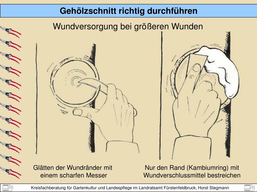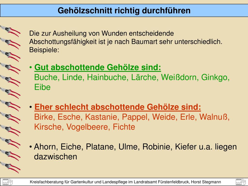 Wann? WINTERSCHNITT (Februar/März) Arbeitserleichterung wegen der Übersichtlichkeit regt zu neuem Wachstum an Pflanz- und Erziehungsschnitt problematische Wundheilung Grundsätzlich eigentlich ungünstiger Zeitpunkt nie bei weniger als - 5 ° C schneiden! FRÜHJAHR/SOMMERSCHNITT (April -August) bessere Wundheilung (Ahorn, Birke, Walnuß nur im August/September) Wachstum wird gebremst kann langfristig zur vorzeitigen Alterung führen naturschutzfachlich problematischer (§ 39 Abs. 5 BNatSchG)