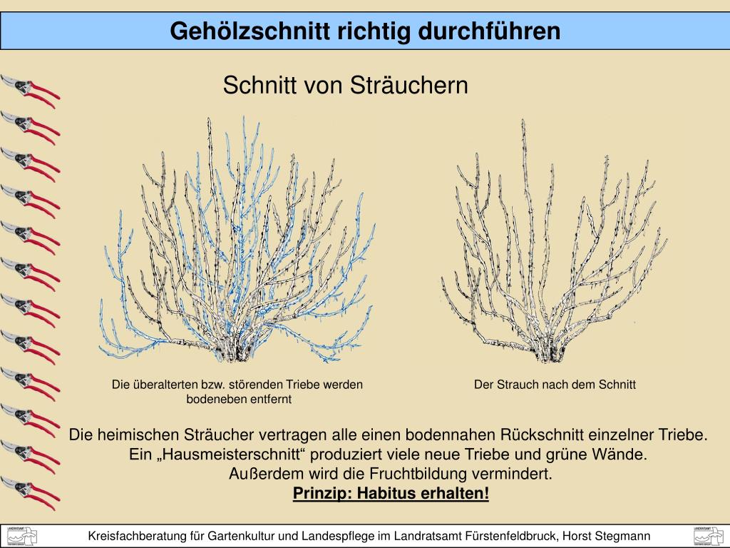 Schnitt von Sträuchern Die überalterten bzw. störenden Triebe werden bodeneben entfernt Der Strauch nach dem Schnitt Die heimischen Sträucher vertragen alle einen bodennahen Rückschnitt einzelner Triebe. Ein „Hausmeisterschnitt“ produziert viele neue Triebe und grüne Wände. Außerdem wird die Fruchtbildung vermindert. Prinzip: Habitus erhalten!