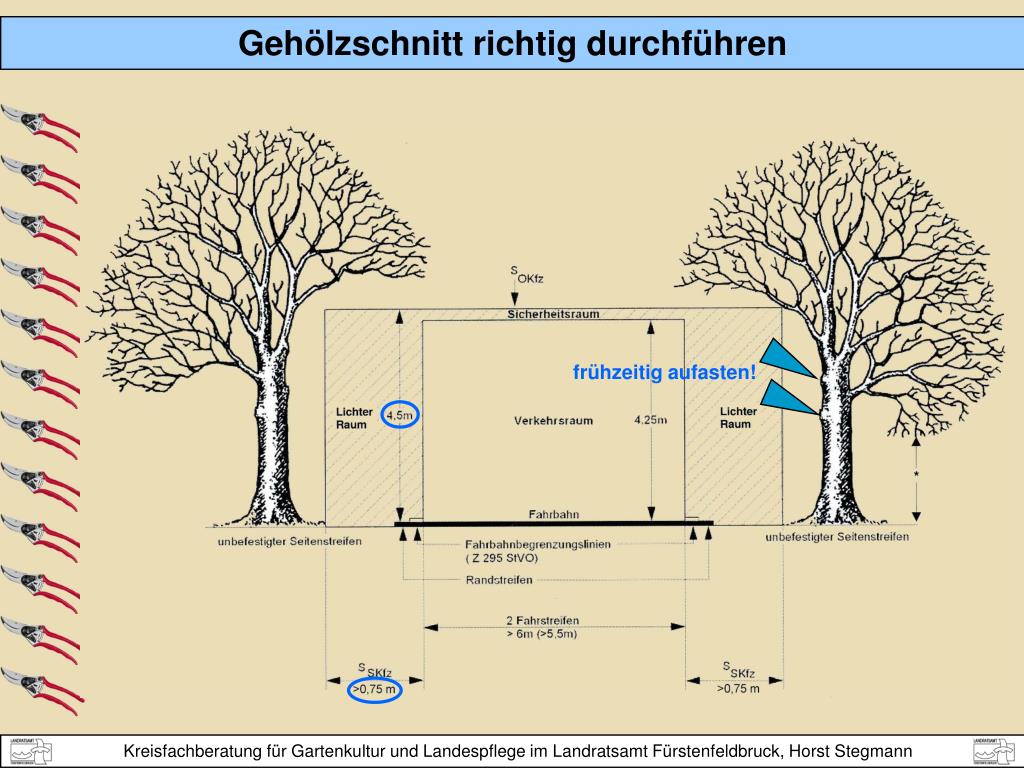 Anerkannter Stand der Technik / Richtlinien: • ZTV-Baumpflege: Zusätzliche Technische Vertragsbe- • dingungen und Richtlinien für Baumpflege (Stand 2006) • ZTV Baum-StB 04: Richtlinien für Baumpflegearbeiten im • Straßenbau, Stand 2004 (behördenverbindlich) • Herausgeber: Forschungsgesellschaft Landschaftsentwicklung Landschaftsbau e.V. (FLL) • Ausarbeitung: Regelwerksausschuss ZTV-Baumpflege • Ziel: „Möglichst vitale und gesunde sowie verkehrssichere Bäume“ • Andere Fachnormen bzw. Gesetze mit Überschneidungen: • RAS-LP 4: Richtlinien für die Anlage von Straßen, Teil 1 (Landschaftspflege) • DIN 18920: Vegetationstechnik im Landschaftsbau - Schutz von Bäumen, • Pflanzenbeständen und Vegetationsflächen bei Baumaßnahmen) • BNatSchG vom 1.3.2010 (insbes. § 39 Abs 5 Satz 1 Nr. 2) • BayNatSchG vom 1.3.2011 (insbes. Art. 16)