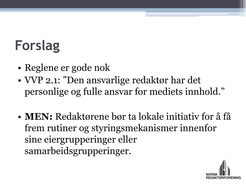 Forslag • Reglene er gode nok • VVP 2.1: ”Den ansvarlige redaktør har det personlige og fulle ansvar for mediets innhold.” • MEN: Redaktørene bør ta lokale initiativ for å få frem rutiner og styringsmekanismer innenfor sine eiergrupperinger eller samarbeidsgrupperinger.