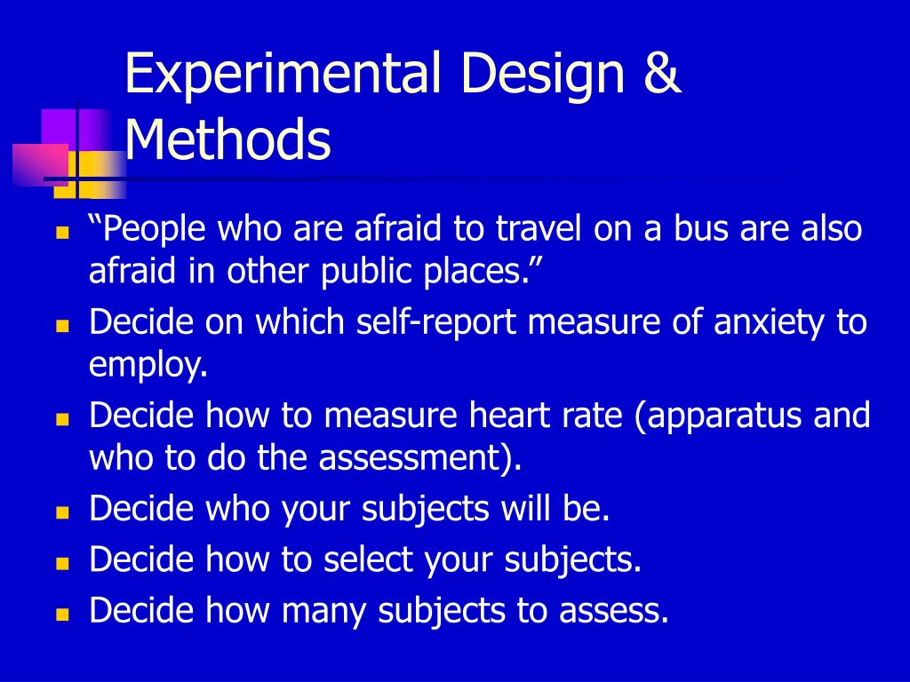 Experimental Design & Methods • “People who are afraid to travel on a bus are also afraid in other public places.” • Decide on which self-report measure of anxiety to employ. • Decide how to measure heart rate (apparatus and who to do the assessment). • Decide who your subjects will be. • Decide how to select your subjects. • Decide how many subjects to assess.