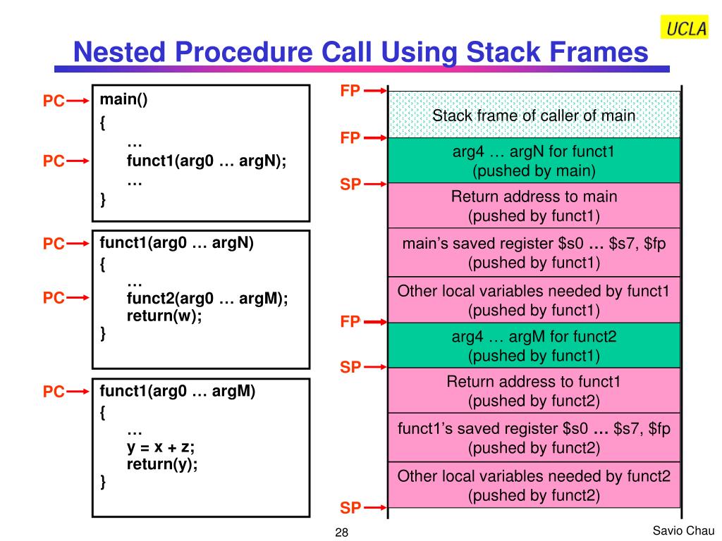 FP PC SP PC FP FP SP PC PC SP PC FP SP SP FP Nested Procedure Call Using Stack Frames main() { … funct1(arg0 … argN); … } Stack frame of caller of main arg4 … argN for funct1 (pushed by main) Return address to main (pushed by funct1) main’s saved register $s0 … $s7, $fp (pushed by funct1) funct1(arg0 … argN) { … funct2(arg0 … argM); return(w); } Other local variables needed by funct1 (pushed by funct1) arg4 … argM for funct2 (pushed by funct1) Return address to funct1 (pushed by funct2) funct1(arg0 … argM) { … y = x + z; return(y); } funct1’s saved register $s0 … $s7, $fp (pushed by funct2) Other local variables needed by funct2 (pushed by funct2)