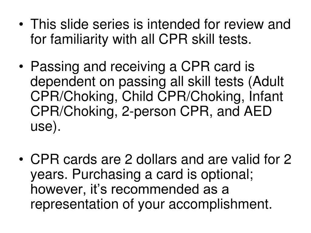 This slide series is intended for review and for familiarity with all CPR skill tests. • Passing and receiving a CPR card is dependent on passing all skill tests (Adult CPR/Choking, Child CPR/Choking, Infant CPR/Choking, 2-person CPR, and AED use). • CPR cards are 2 dollars and are valid for 2 years. Purchasing a card is optional; however, it’s recommended as a representation of your accomplishment.