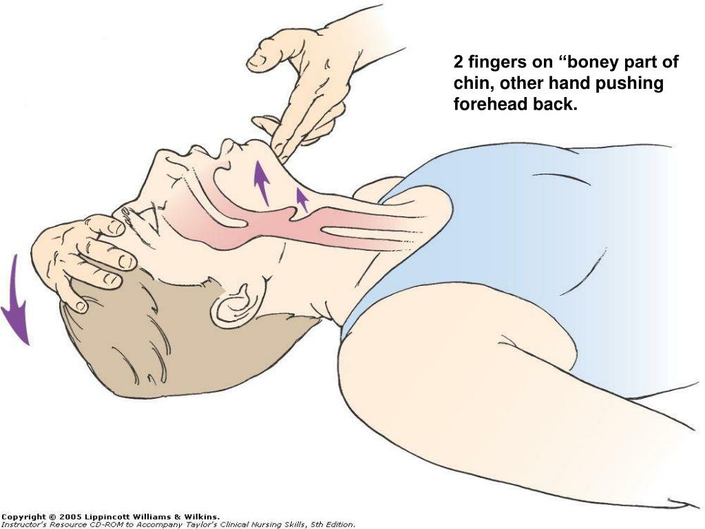 2 fingers on “boney part of chin, other hand pushing forehead back.