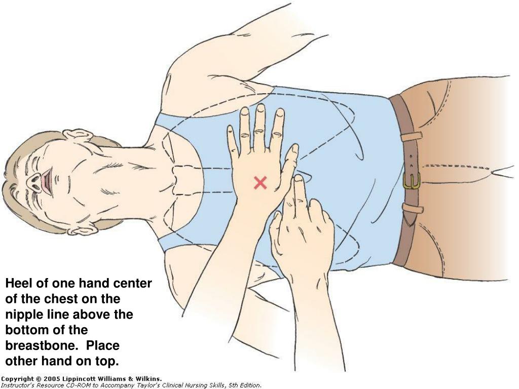 Heel of one hand center of the chest on the nipple line above the bottom of the breastbone. Place other hand on top.