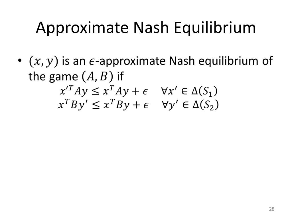 PPAD [Papadimitriou 1994] Suppose that an exponentially large graph with vertex set {0,1}nis defined by two circuits: possible previous P(v)=u and N(u)=v Finding Nash equilibria, even in 2-person games is PPAD –complete. node id node id v u [Daskalakis, Goldberg, Papadimitriou 05], [Chen, Deng 06’] node id node id N P possible next GivenP and N: If0n is an unbalanced node, find another unbalanced node. Otherwise say “yes”. END OF THE LINE: { Search problems in FNP reducible to END OF THE LINE} PPAD =
