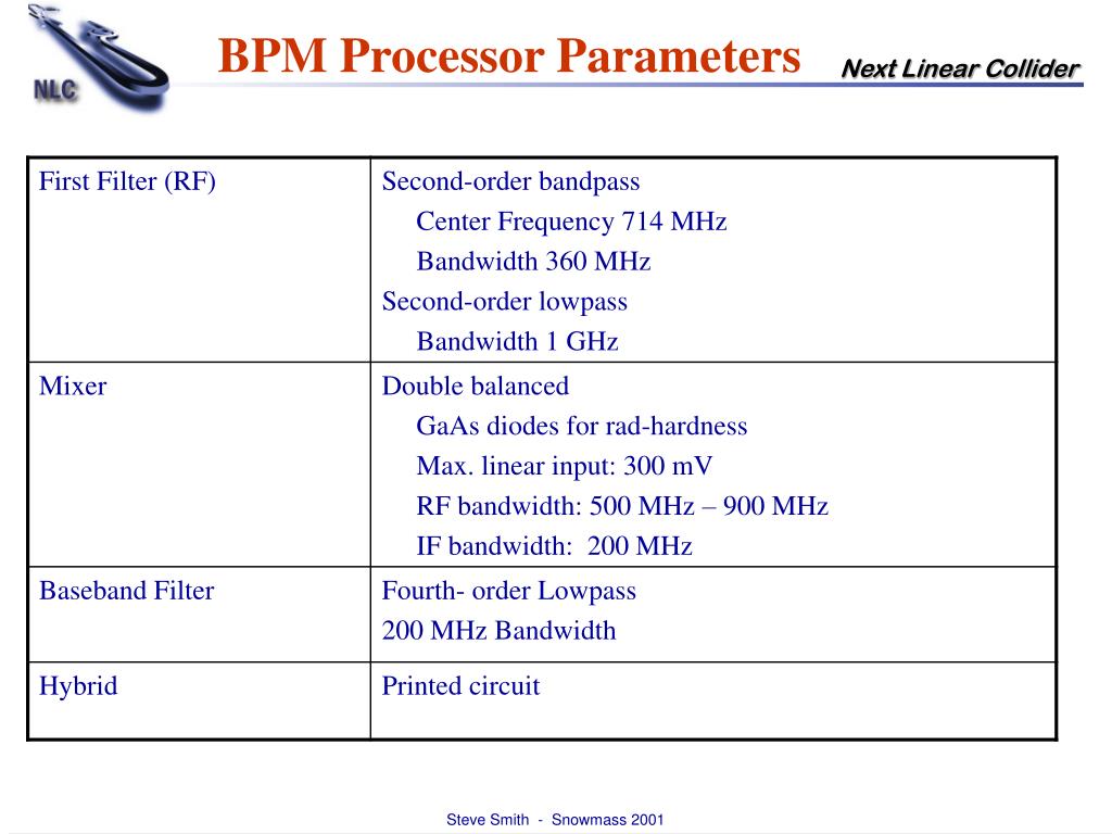 Beam Position Monitor • BPM Pickup • 50 Ohm striplines • 1 cm radius • 10 cm long • 7% angular coverage • 4 m from IP • Must be careful of propagating RF from IP region • BPM Processor • Fast, < 3 ns propagation delay (+ cable lengths) • Amplitude difference at 714 MHz • Downconvert to baseband • (need to phase BPM) • Wideband: 200 MHz at baseband • Modest resolution requirement • Need only s < 25 mm rms at BPM • Johnson noise resolution limit ~ 50 nm (< 1pm beam-beam offset) • Must suppress interference • A secondary electron knocked off stripline makes apparent position shift of ~ 1 pm • An imbalance of 8x105 (10-4 of bunch) causes a 1 micron error