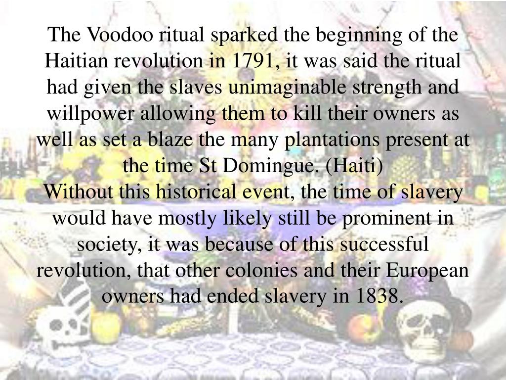 The Voodoo ritual sparked the beginning of the Haitian revolution in 1791, it was said the ritual had given the slaves unimaginable strength and willpower allowing them to kill their owners as well as set a blaze the many plantations present at the time St Domingue. (Haiti)Without this historical event, the time of slavery would have mostly likely still be prominent in society, it was because of this successful revolution, that other colonies and their European owners had ended slavery in 1838.