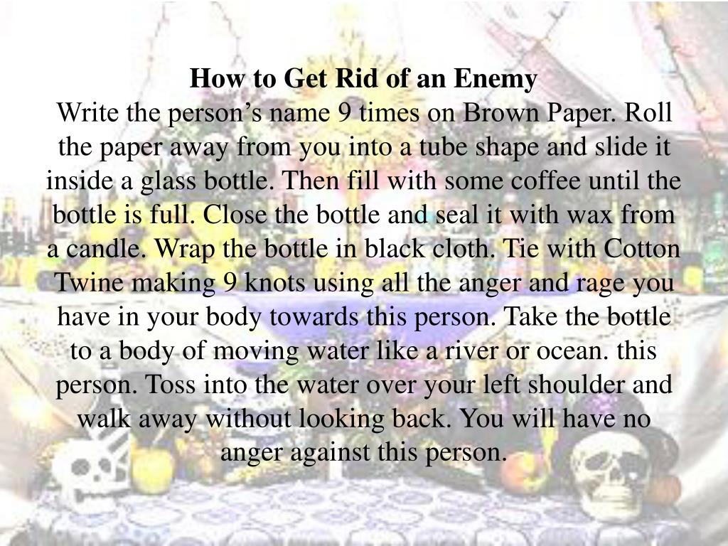 How to Get Rid of an EnemyWrite the person’s name 9 times on Brown Paper. Roll the paper away from you into a tube shape and slide it inside a glass bottle. Then fill with some coffee until the bottle is full. Close the bottle and seal it with wax from a candle. Wrap the bottle in black cloth. Tie with Cotton Twine making 9 knots using all the anger and rage you have in your body towards this person. Take the bottle to a body of moving water like a river or ocean. this person. Toss into the water over your left shoulder and walk away without looking back. You will have no anger against this person.