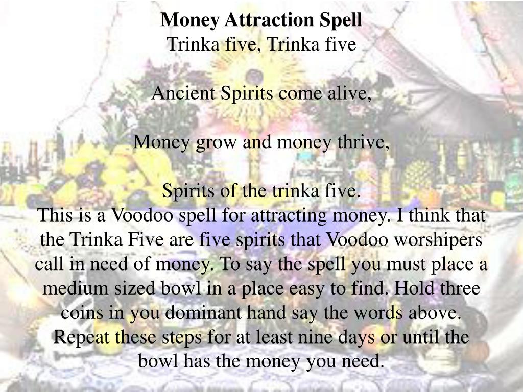 Money Attraction SpellTrinka five, Trinka fiveAncient Spirits come alive,Money grow and money thrive,Spirits of the trinka five.This is a Voodoo spell for attracting money. I think that the Trinka Five are five spirits that Voodoo worshipers call in need of money. To say the spell you must place a medium sized bowl in a place easy to find. Hold three coins in you dominant hand say the words above. Repeat these steps for at least nine days or until the bowl has the money you need.