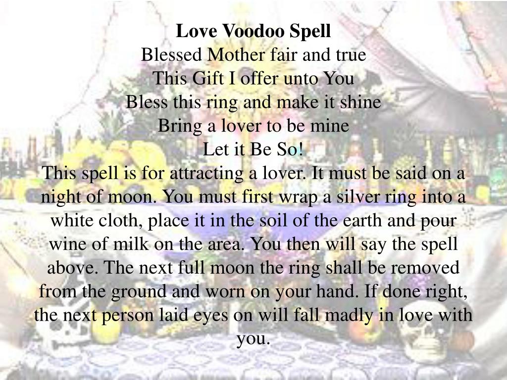 Love Voodoo SpellBlessed Mother fair and trueThis Gift I offer unto YouBless this ring and make it shineBring a lover to be mineLet it Be So!This spell is for attracting a lover. It must be said on a night of moon. You must first wrap a silver ring into a white cloth, place it in the soil of the earth and pour wine of milk on the area. You then will say the spell above. The next full moon the ring shall be removed from the ground and worn on your hand. If done right, the next person laid eyes on will fall madly in love with you.