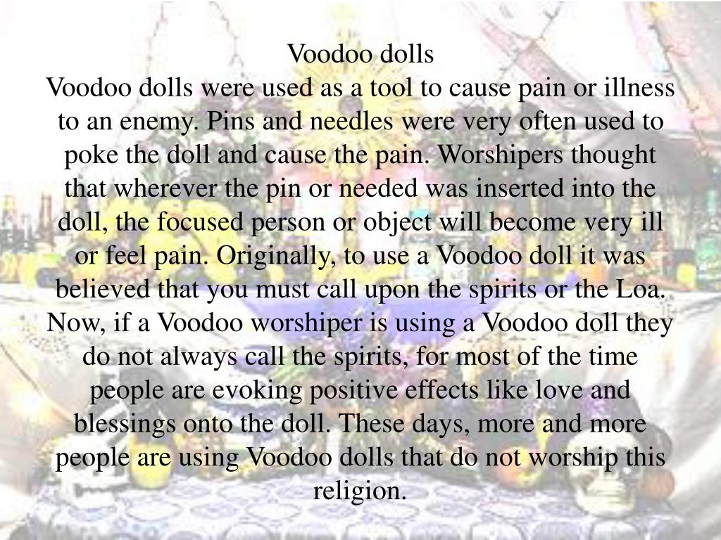 Voodoo dollsVoodoo dolls were used as a tool to cause pain or illness to an enemy. Pins and needles were very often used to poke the doll and cause the pain. Worshipers thought that wherever the pin or needed was inserted into the doll, the focused person or object will become very ill or feel pain. Originally, to use a Voodoo doll it was believed that you must call upon the spirits or the Loa. Now, if a Voodoo worshiper is using a Voodoo doll they do not always call the spirits, for most of the time people are evoking positive effects like love and blessings onto the doll. These days, more and more people are using Voodoo dolls that do not worship this religion.