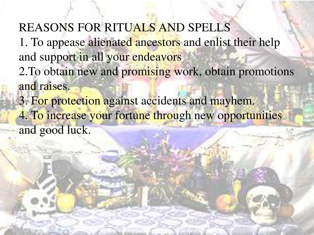 REASONS FOR RITUALS AND SPELLS1. To appease alienated ancestors and enlist their help and support in all your endeavors 2.To obtain new and promising work, obtain promotions and raises.3. For protection against accidents and mayhem. 4. To increase your fortune through new opportunities and good luck.