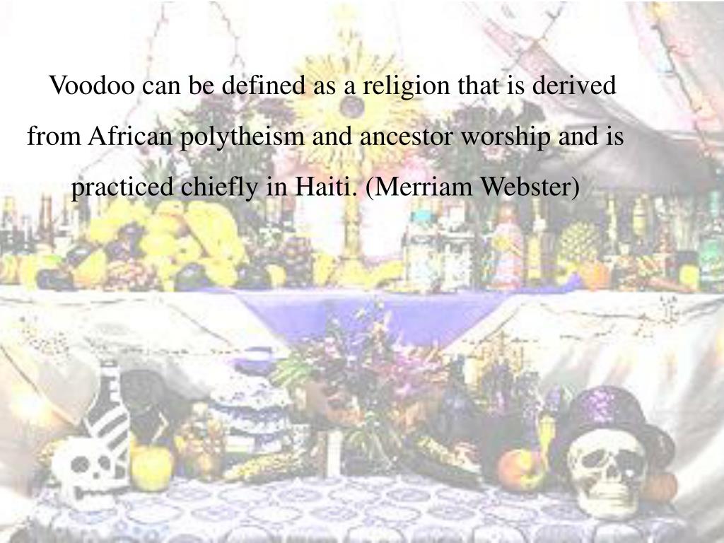 Voodoo can be defined as a religion that is derived from African polytheism and ancestor worship and is practiced chiefly in Haiti. (Merriam Webster)