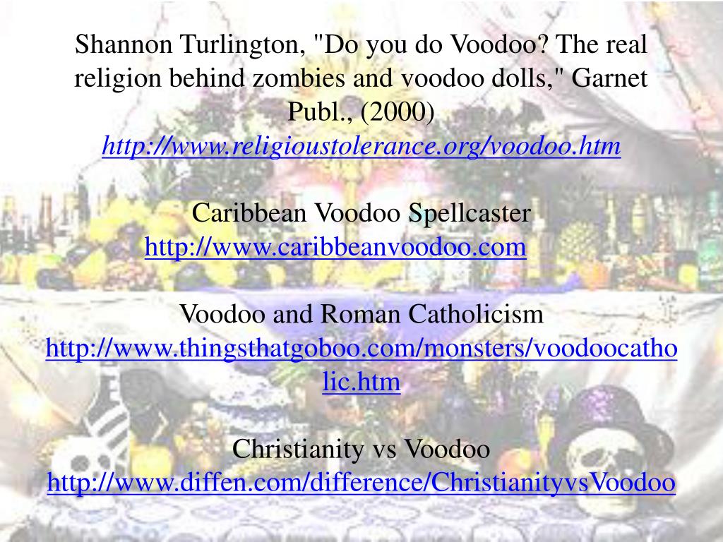 Shannon Turlington, "Do you do Voodoo? The real religion behind zombies and voodoo dolls," Garnet Publ., (2000)http://www.religioustolerance.org/voodoo.htmCaribbean Voodoo Spellcasterhttp://www.caribbeanvoodoo.comVoodoo and Roman Catholicismhttp://www.thingsthatgoboo.com/monsters/voodoocatholic.htmChristianity vs Voodoohttp://www.diffen.com/difference/ChristianityvsVoodoo