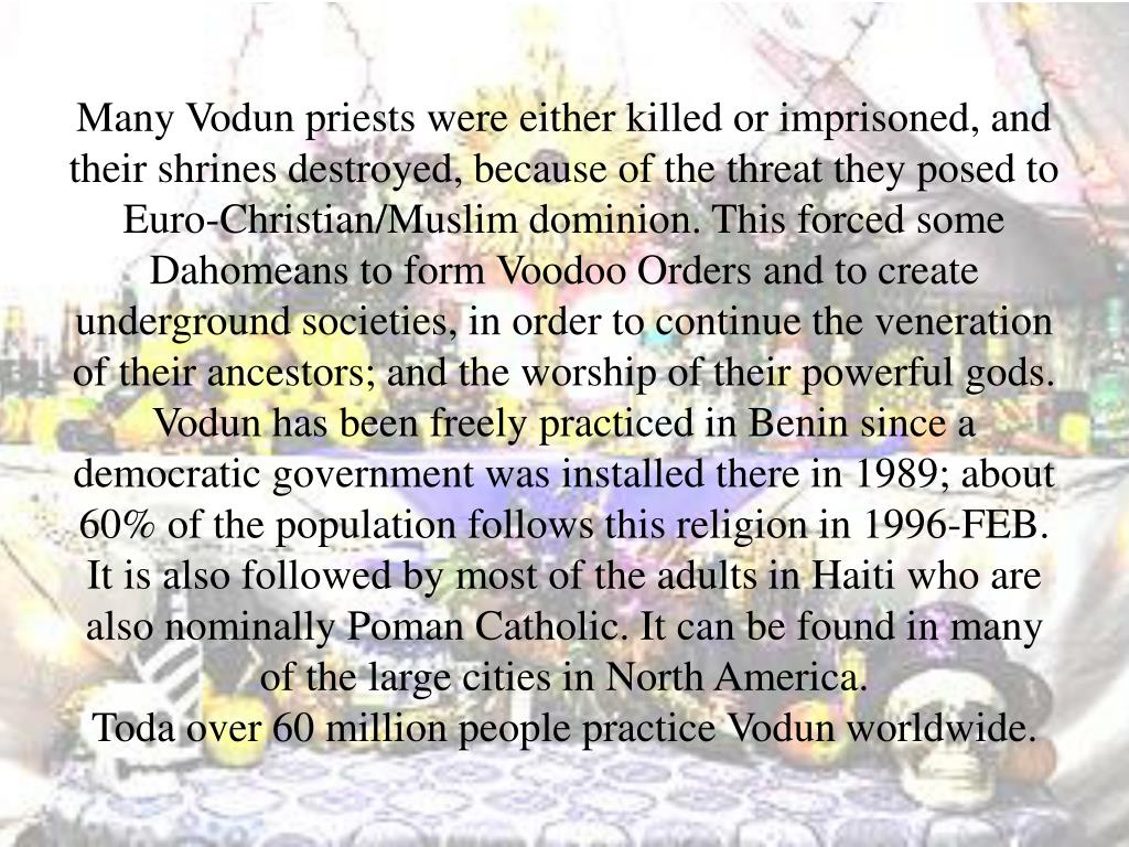 Many Vodun priests were either killed or imprisoned, and their shrines destroyed, because of the threat they posed to Euro-Christian/Muslim dominion. This forced some Dahomeans to form Voodoo Orders and to create underground societies, in order to continue the veneration of their ancestors; and the worship of their powerful gods.Vodun has been freely practiced in Benin since a democratic government was installed there in 1989; about 60% of the population follows this religion in 1996-FEB. It is also followed by most of the adults in Haiti who are also nominally Poman Catholic. It can be found in many of the large cities in North America.Toda over 60 million people practice Vodun worldwide.