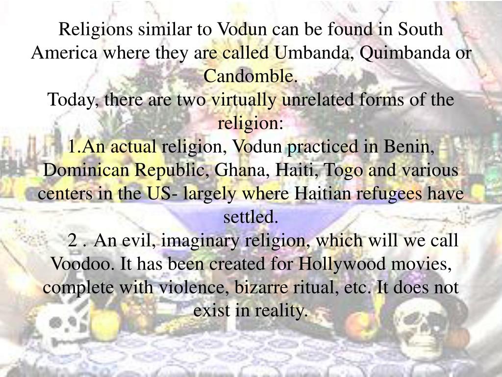 Religions similar to Voduncan be found in South America where they are called Umbanda, Quimbanda or Candomble.Today, there are two virtually unrelated forms of the religion:1.An actual religion, Vodun practiced in Benin, Dominican Republic, Ghana, Haiti, Togo and various centers in the US- largely where Haitian refugees have settled. 2 . An evil, imaginary religion, which will we call Voodoo. It has been created for Hollywood movies, complete with violence, bizarre ritual, etc. It does not exist in reality.