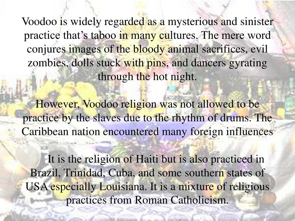 Voodoo is widely regarded as a mysterious and sinister practice that’s taboo in many cultures. The mere word conjures images of the bloody animal sacrifices, evil zombies, dolls stuck with pins, and dancers gyrating through the hot night.However, Voodoo religion was not allowed to be practice by the slaves due to the rhythm of drums. The Caribbean nation encountered many foreign influences It is the religion of Haiti but is also practiced in Brazil, Trinidad, Cuba, and some southern states of USA especially Louisiana. It is a mixture of religious practices from Roman Catholicism.