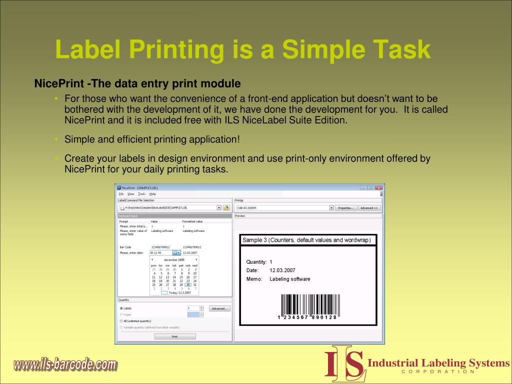 Label Printing is a Simple Task NicePrint -The data entry print module • For those who want the convenience of a front-end application but doesn’t want to be bothered with the development of it, we have done the development for you. It is called NicePrint and it is included free with ILS NiceLabel Suite Edition. • Simple and efficient printing application! • Create your labels in design environment and use print-only environment offered by NicePrint for your daily printing tasks.