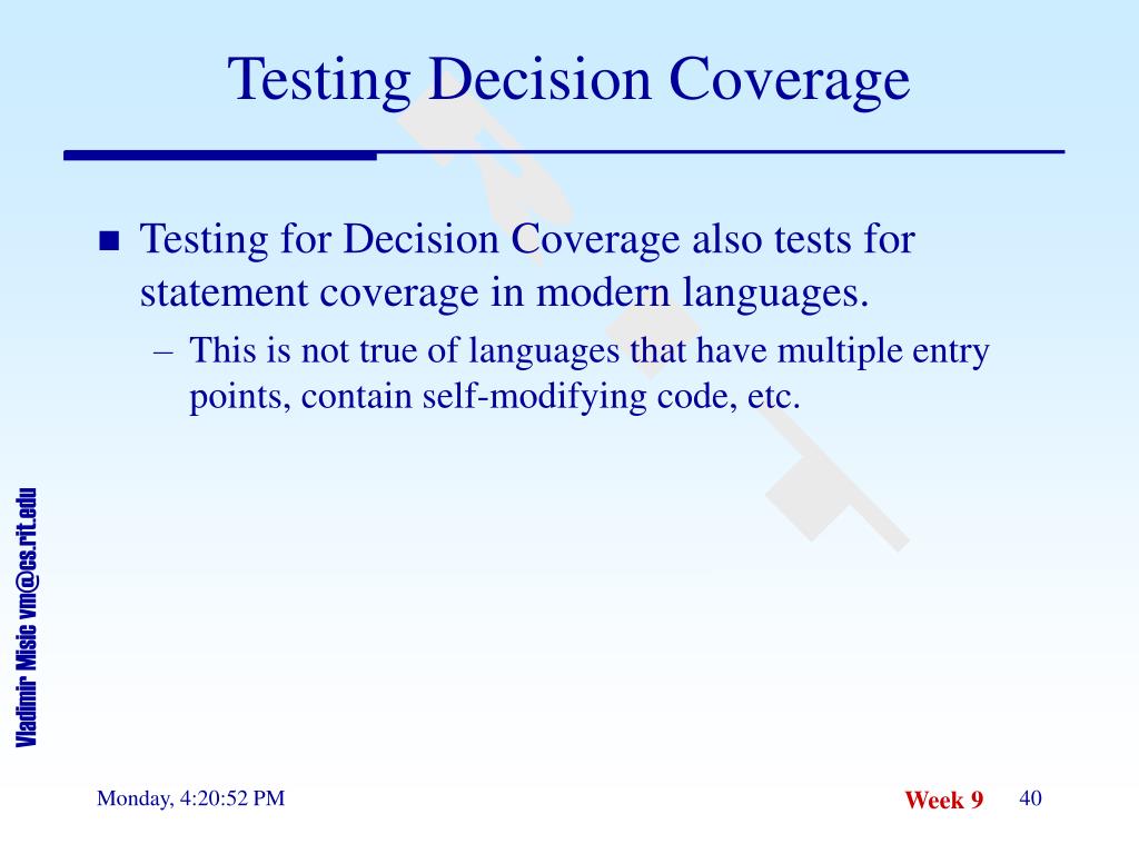 Testing Decision Coverage • Testing for Decision Coverage also tests for statement coverage in modern languages. • This is not true of languages that have multiple entry points, contain self-modifying code, etc.