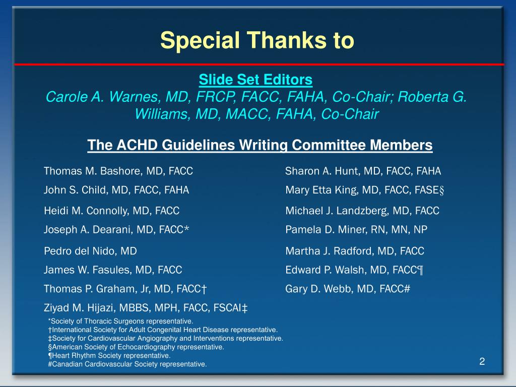 2. Special Thanks to Slide Set Editors Carole A. Warnes, MD, FRCP, FACC, FAHA, Co-Chair; Roberta G. Williams, MD, MACC, FAHA, Co-Chair The ACHD Guidelines Writing Committee Members *Society of Thoracic Surgeons representative. †International Society for Adult Congenital Heart Disease representative. ‡Society for Cardiovascular Angiography and Interventions representative. §American Society of Echocardiography representative. ¶Heart Rhythm Society representative. #Canadian Cardiovascular Society representative.