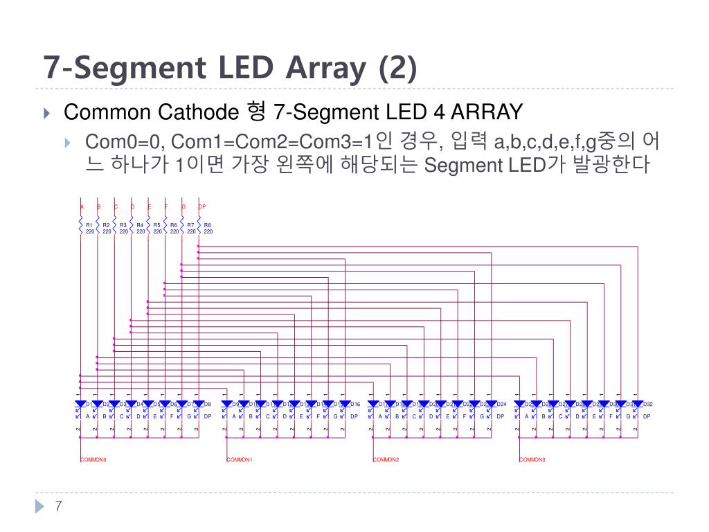 7-Segment LED Array (1) • Common Cathode 형 7-Segment LED 4 ARRAY • 7-Segment LED 가 4개 병렬로 있는 것 • 공통단자가 캐소드형으로 com0, com1, com2, com3로 4개 있으며, 애노드 단자 a,b,c,d,e,f,g,dp는 공통으로 사용한다 • LED를 제어하기 위한 전체 핀의 개수를 줄일 수 있는 장점이 있으나 컨트롤은 조금 복잡해진다