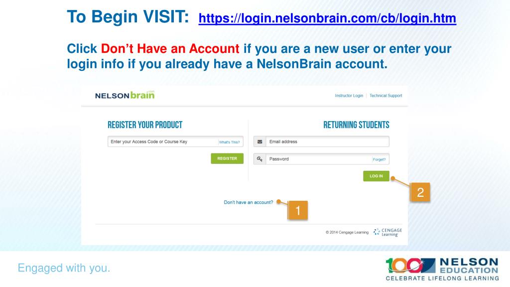 To Begin VISIT: https://login.nelsonbrain.com/cb/login.htm Click Don’t Have an Account if you are a new user or enter your login info if you already have a NelsonBrain account. 2 1