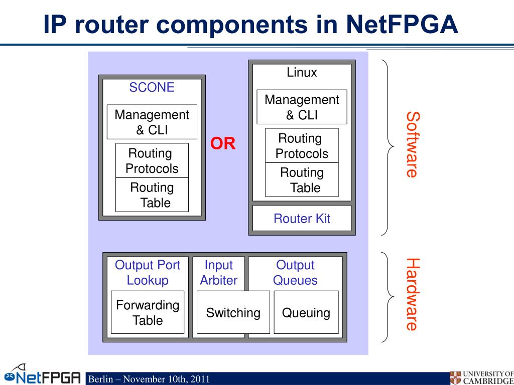 IP router components in NetFPGA Input Arbiter Management & CLI Management & CLI Output Port Lookup Routing Protocols Routing Protocols Routing Table Routing Table Output Queues SCONE Linux Berlin – November 10th, 2011 Router Kit Forwarding Table Queuing Switching OR Software Hardware