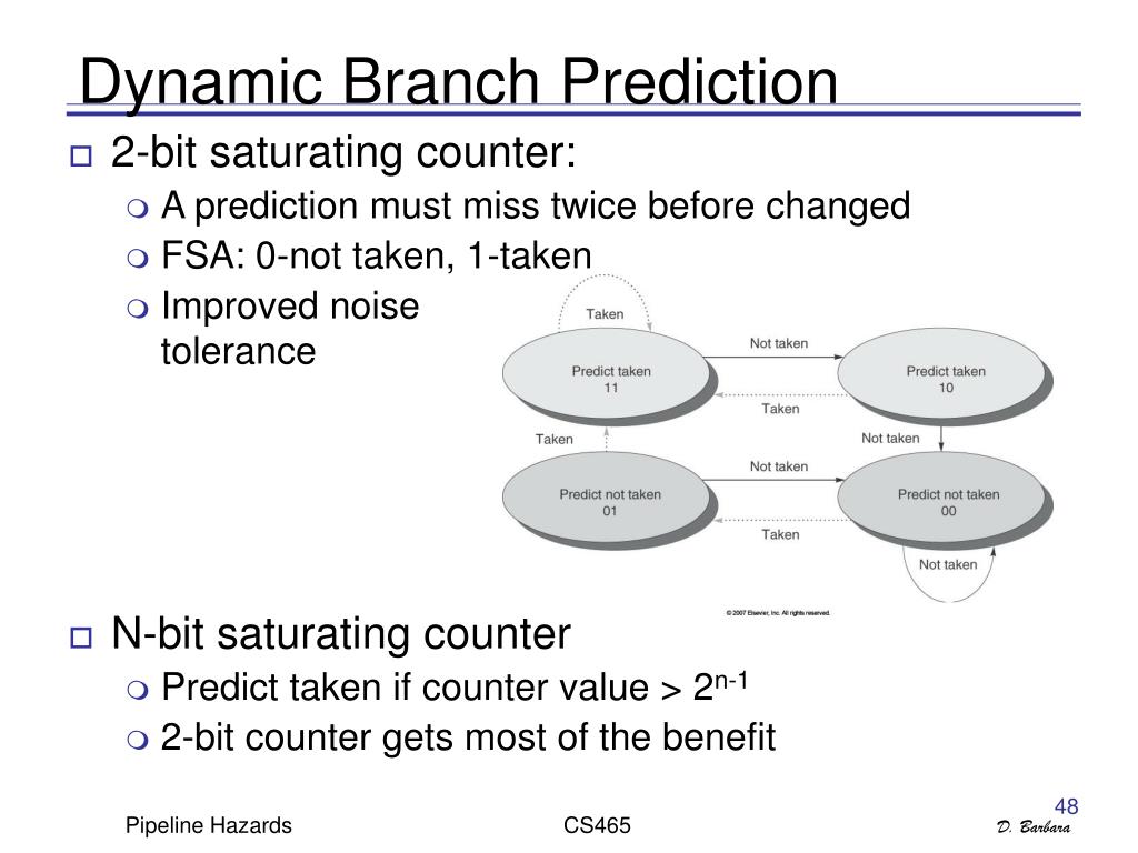 Dynamic Branch Prediction • 2-bit saturating counter: • A prediction must miss twice before changed • FSA: 0-not taken, 1-taken • Improved noise tolerance • N-bit saturating counter • Predict taken if counter value > 2n-1 • 2-bit counter gets most of the benefit CS465