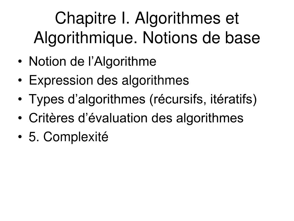 Chapitre I. Algorithmes et Algorithmique. Notions de base • Notion de l’Algorithme • Expression des algorithmes • Types d’algorithmes (récursifs, itératifs) • Critères d’évaluation des algorithmes • 5. Complexité