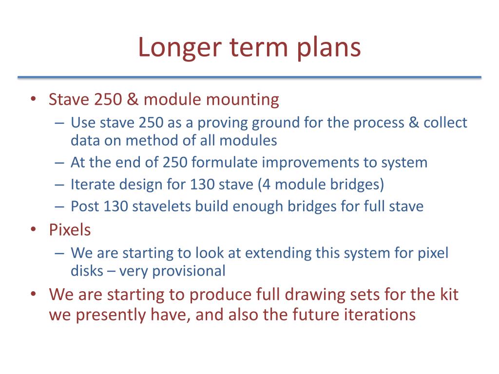 Longer term plans • Stave 250 & module mounting • Use stave 250 as a proving ground for the process & collect data on method of all modules • At the end of 250 formulate improvements to system • Iterate design for 130 stave (4 module bridges) • Post 130 stavelets build enough bridges for full stave • Pixels • We are starting to look at extending this system for pixel disks – very provisional • We are starting to produce full drawing sets for the kit we presently have, and also the future iterations