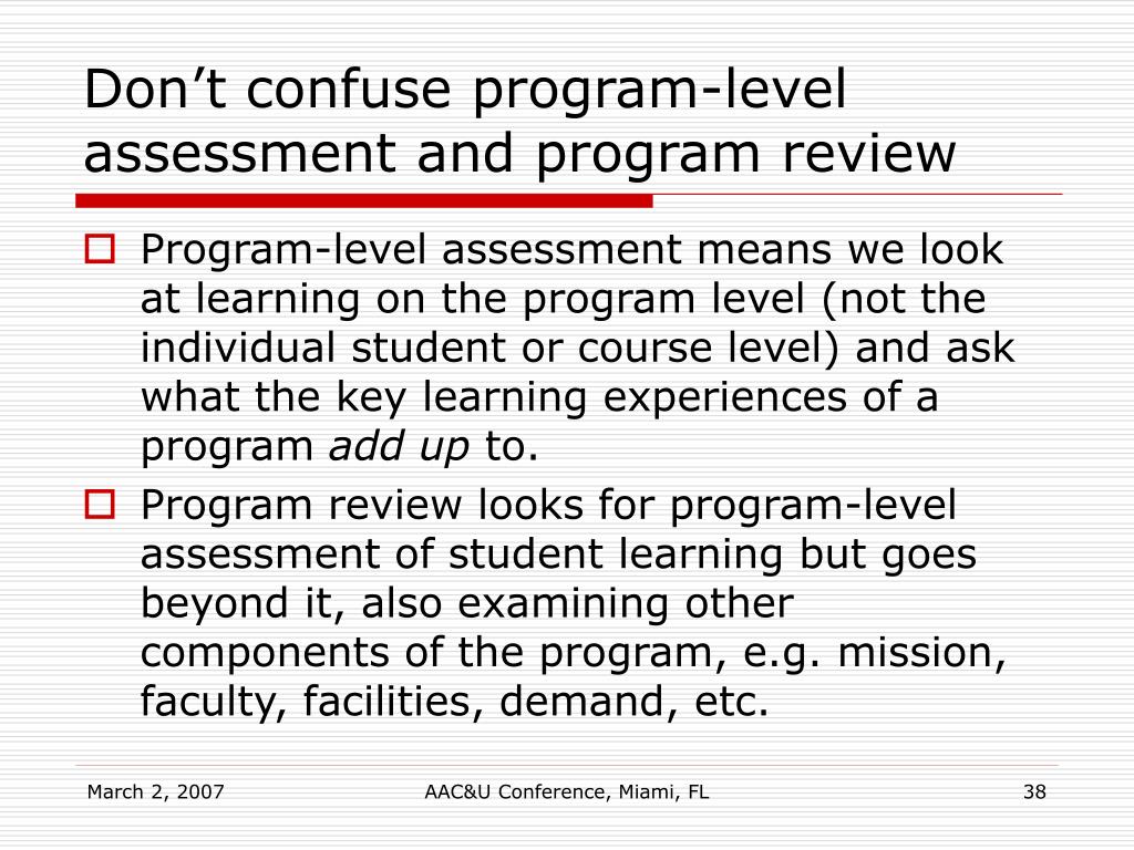 Don’t confuse program-level assessment and program review • Program-level assessment means we look at learning on the program level (not the individual student or course level) and ask what the key learning experiences of a program add up to. • Program review looks for program-level assessment of student learning but goes beyond it, also examining other components of the program, e.g. mission, faculty, facilities, demand, etc. AAC&U Conference, Miami, FL