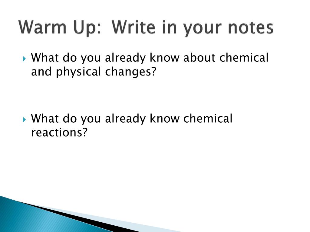 Warm Up: Write in your notes • What do you already know about chemical and physical changes? • What do you already know chemical reactions?