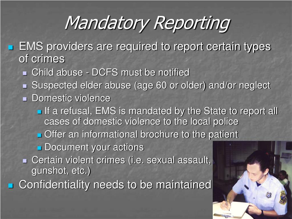 Mandatory Reporting • EMS providers are required to report certain types of crimes • Child abuse - DCFS must be notified • Suspected elder abuse (age 60 or older) and/or neglect • Domestic violence • If a refusal, EMS is mandated by the State to report all cases of domestic violence to the local police • Offer an informational brochure to the patient • Document your actions • Certain violent crimes (i.e. sexual assault, gunshot, etc.) • Confidentiality needs to be maintained