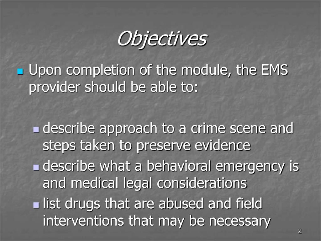 Objectives • Upon completion of the module, the EMS provider should be able to: • describe approach to a crime scene and steps taken to preserve evidence • describe what a behavioral emergency is and medical legal considerations • list drugs that are abused and field interventions that may be necessary