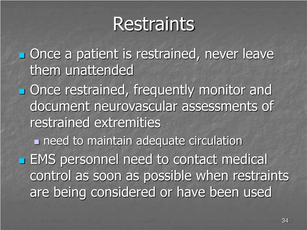 Restraints • Once a patient is restrained, never leave them unattended • Once restrained, frequently monitor and document neurovascular assessments of restrained extremities • need to maintain adequate circulation • EMS personnel need to contact medical control as soon as possible when restraints are being considered or have been used