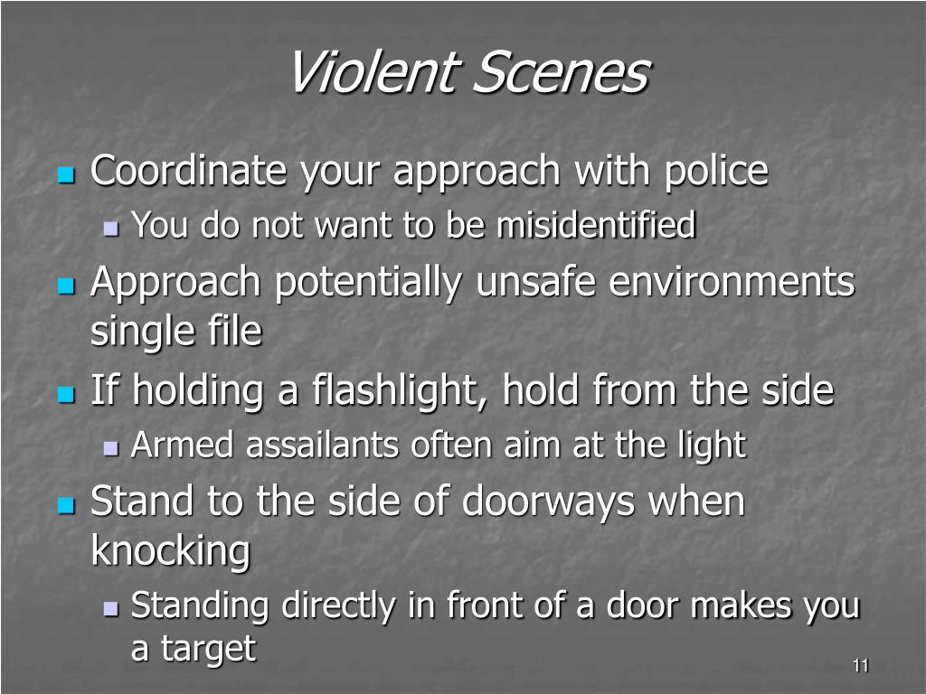 Violent Scenes • Coordinate your approach with police • You do not want to be misidentified • Approach potentially unsafe environments single file • If holding a flashlight, hold from the side • Armed assailants often aim at the light • Stand to the side of doorways when knocking • Standing directly in front of a door makes you a target