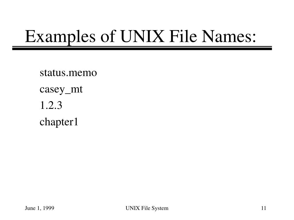 Examples of UNIX File Names: status.memo casey_mt 1.2.3 chapter1 UNIX File System