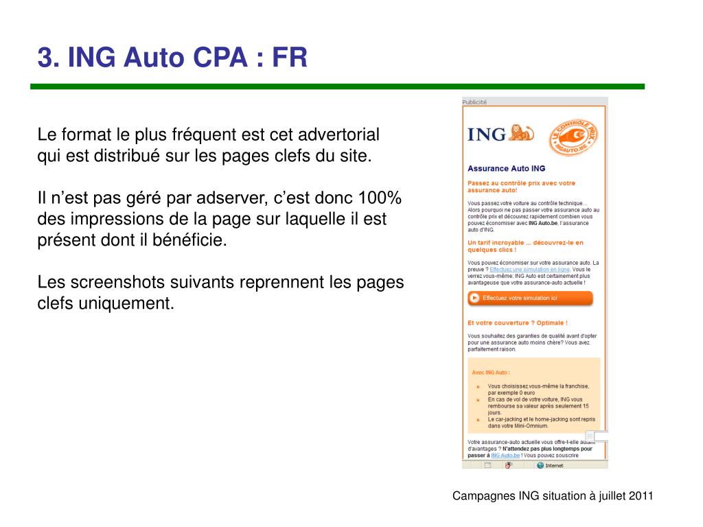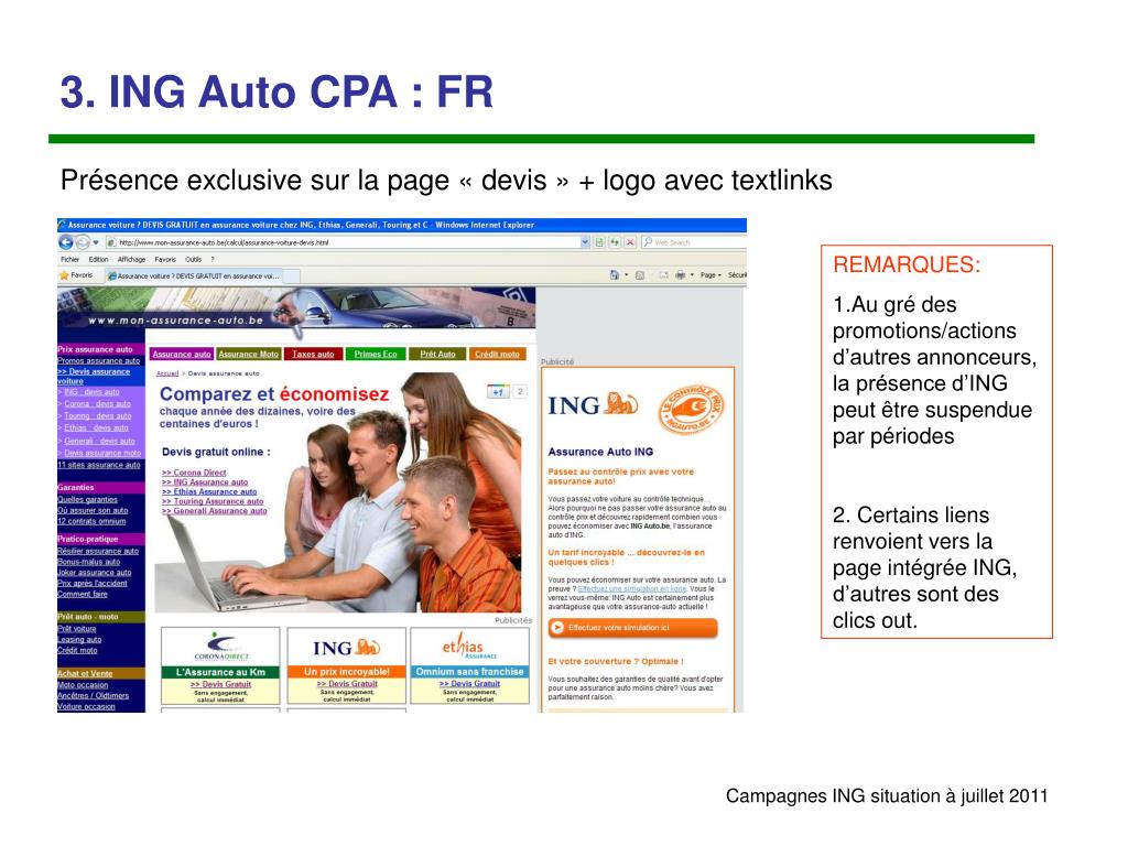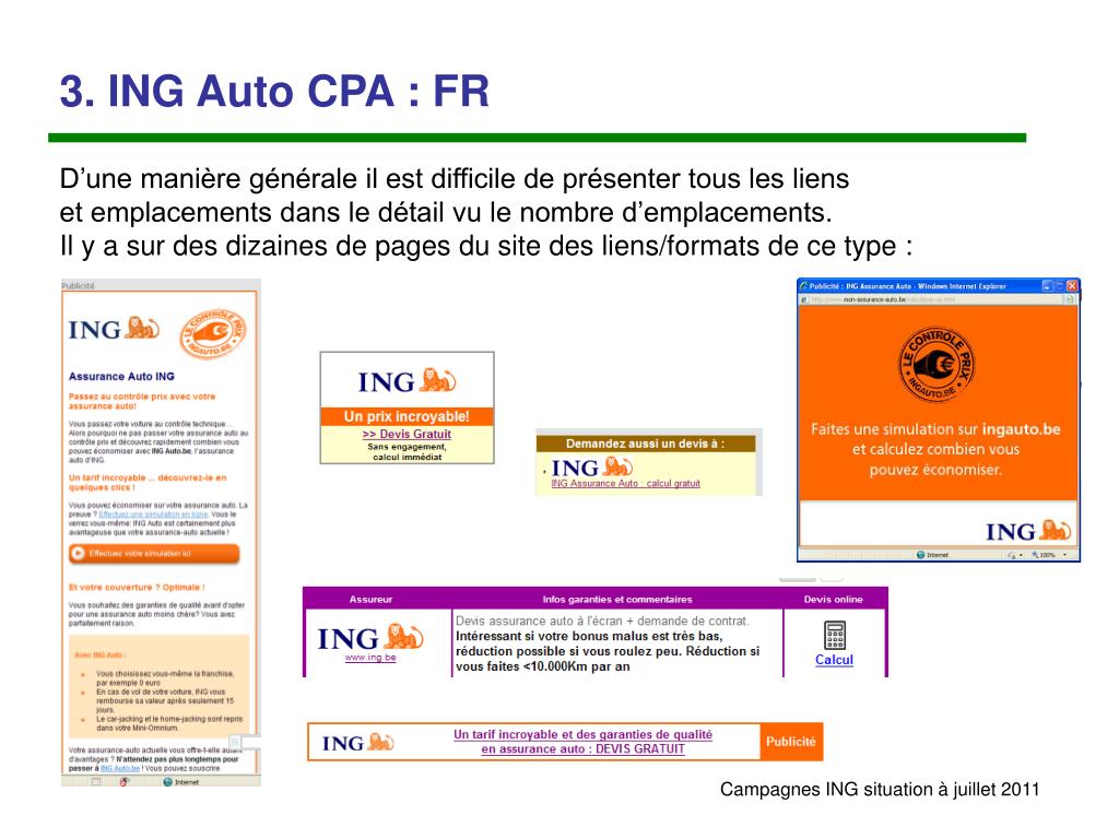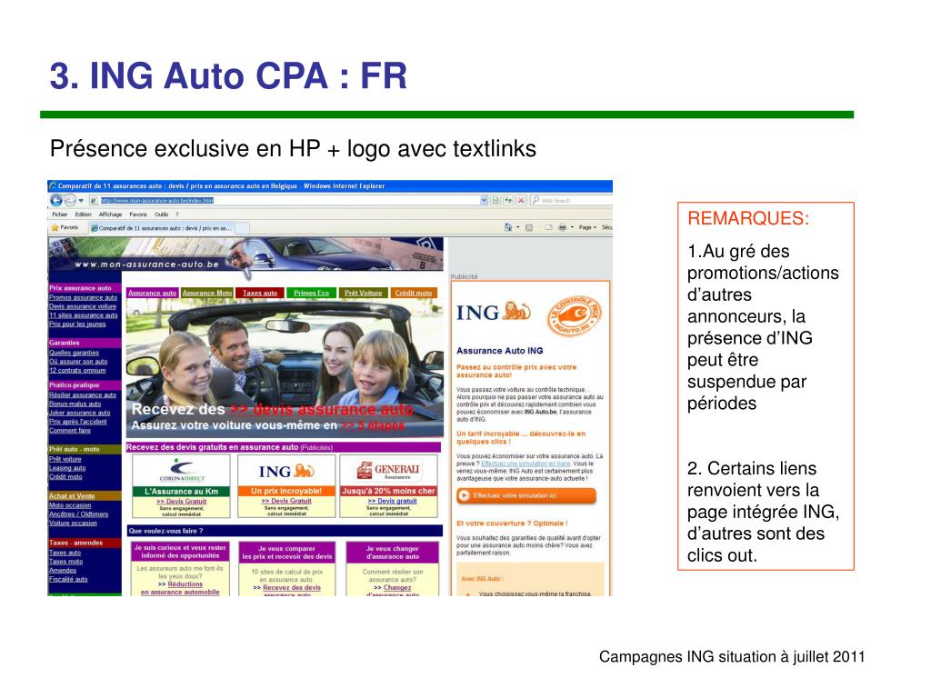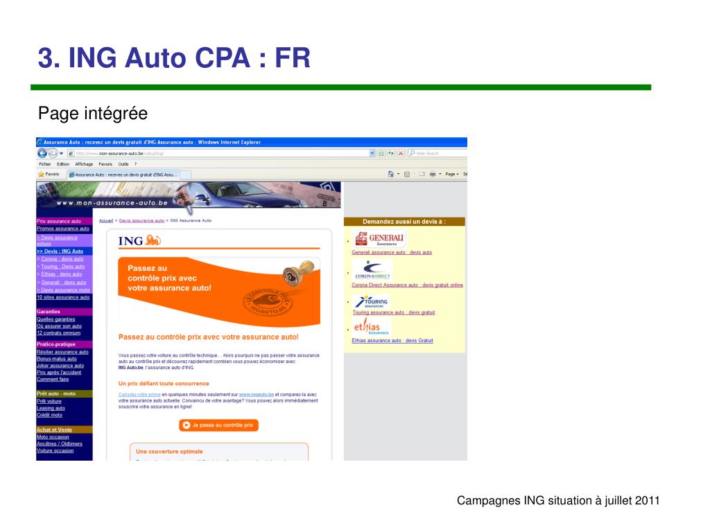 3. ING Auto CPA : FR Présence exclusive sur la page «11 sites assurance auto» + logo avec textlinks REMARQUES: 1.Au gré des promotions/actions d’autres annonceurs, la présence d’ING peut être suspendue par périodes 2. Certains liens renvoient vers la page intégrée ING, d’autres sont des clics out.