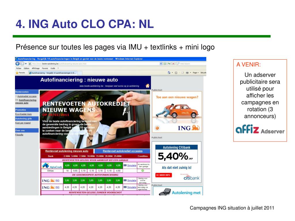 4. ING Auto CLO CPA: NL Présence sur toutes les pages via IMU + textlinks + mini logo A VENIR: Un adserver publicitaire sera utilisé pour afficher les campagnes en rotation (3 annonceurs)
