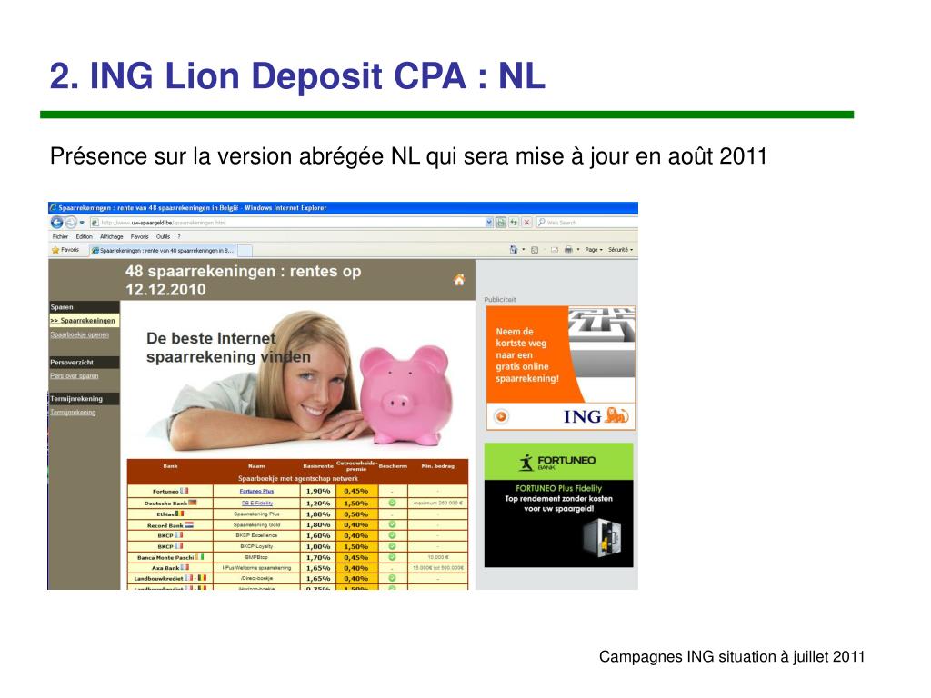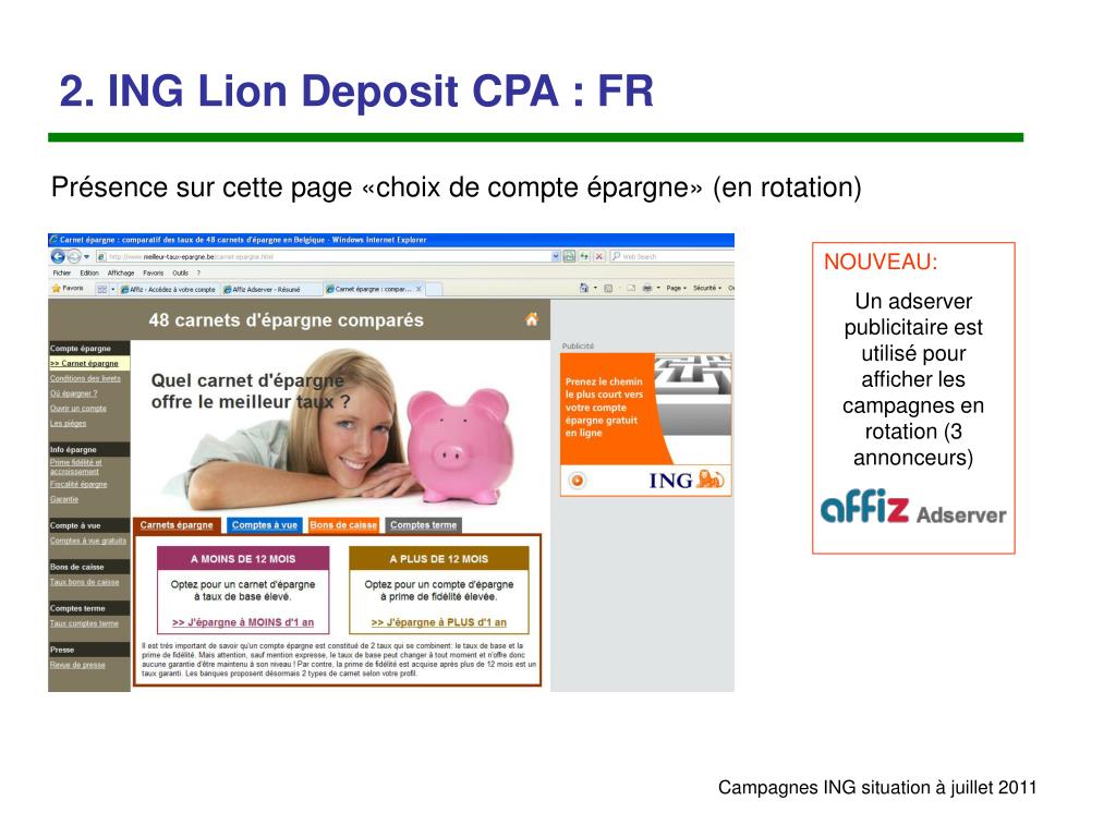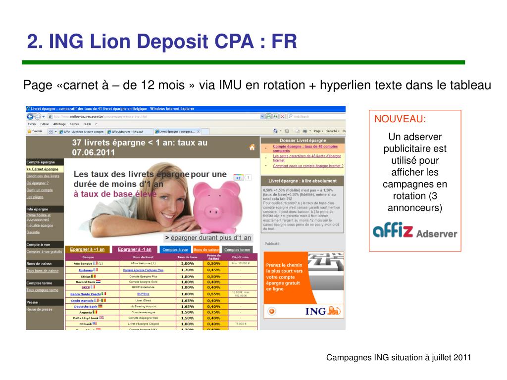 1. ING Lion Account CPA : FR Présence sur cette page en rotation via l’IMU + lien texte dans tableau NOUVEAU: Un adserver publicitaire est utilisé pour afficher les campagnes en rotation (3 annonceurs)