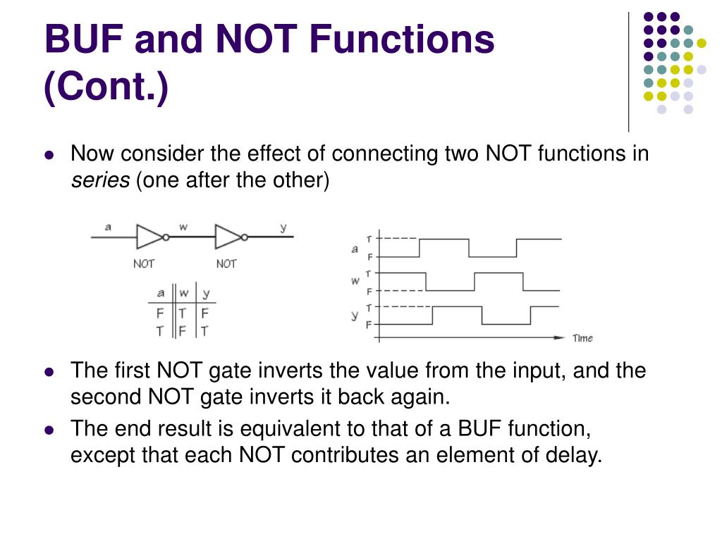 BUF and NOT Functions (Cont.) • Now consider the effect of connecting two NOT functions in series (one after the other) • The first NOT gate inverts the value from the input, and the second NOT gate inverts it back again. • The end result is equivalent to that of a BUF function, except that each NOT contributes an element of delay.