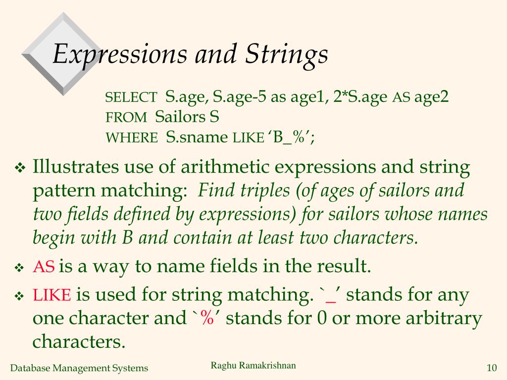 Expressions and Strings SELECT S.age, S.age-5 as age1, 2*S.age AS age2 FROM Sailors S WHERE S.sname LIKE ‘B_%’; • Illustrates use of arithmetic expressions and string pattern matching: Find triples (of ages of sailors and two fields defined by expressions) for sailors whose names begin with B and contain at least two characters. • ASis a way to name fields in the result. • LIKE is used for string matching. `_’ stands for any one character and `%’ stands for 0 or more arbitrary characters. Raghu Ramakrishnan