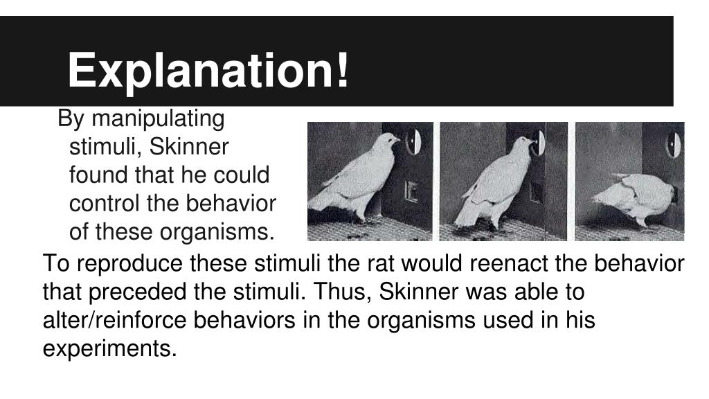 Explanation! By manipulating stimuli, Skinner found that he could control the behavior of these organisms. To reproduce these stimuli the rat would reenact the behavior that preceded the stimuli. Thus, Skinner was able to alter/reinforce behaviors in the organisms used in his experiments.