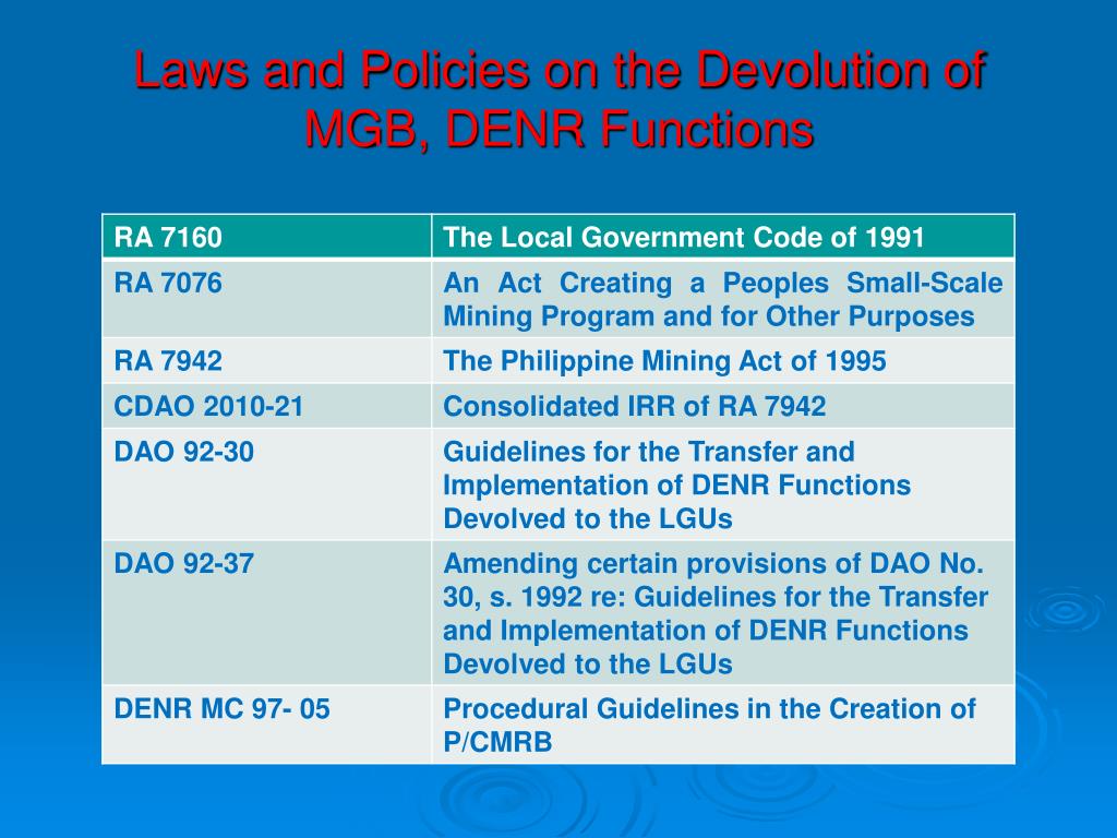 Devolved Functions of the MGBDENR DAO 92-30 as amended by DAO 92-37 Enforcement of small-scale mining laws involving areas not declared as govt. mineral reservations, subject to policies, standards and guidelines of the DENR